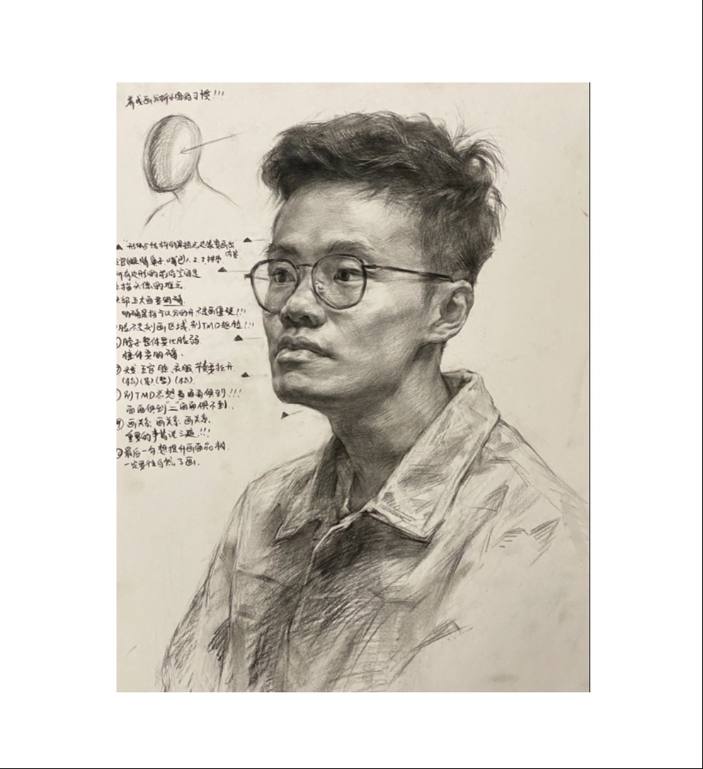 大学基础部期间素描作品曾获广州美术学院镇泰·素描基础教学奖,作品收录在《广州美术学院造型基础部优秀作品集素描卷》